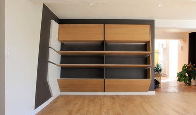 Entièrement suspendue au mur, cette création intègre du linéaire pour une grande quantité de livres, mais aussi du rangement fermé pour stocker. Un éclairage LED vient souligner le meuble pour le faire participer à la décoration de la pièce.